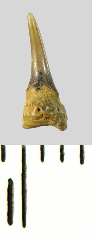 Мелкий боковой зуб с коронкой серого цвета, колюще-режущего типа, S-образно изогнутой, с гладким режущим краем. С лингвальной стороны у основания коронки на эмали имеется скульптура в виде слабой продольной струйчатости. Корень охристый, арочный, умеренно массивный, со следами окатанности. Имеется одна питательная борозда с лингвальной стороны корня. Добавочные зубцы коронки зуба отсутствуют.