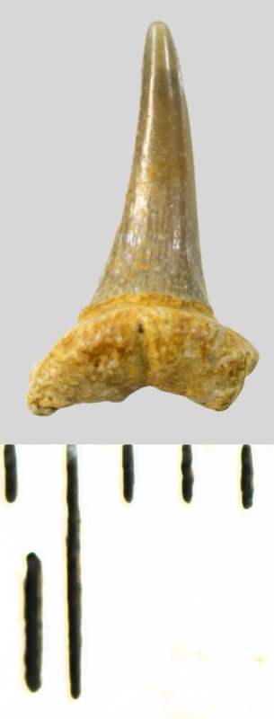 Мелкий боковой зуб с коронкой серого цвета, колюще-режущего типа, S-образно изогнутой, с гладким режущим краем. С лингвальной стороны у основания коронки на эмали имеется скульптура в виде слабой продольной струйчатости. Корень охристый, арочный, умеренно массивный, со следами окатанности. Имеется одна питательная борозда с лингвальной стороны корня. Добавочные зубцы коронки зуба отсутствуют.