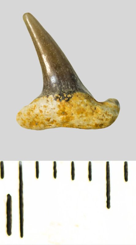 Мелкий боковой зуб с коронкой серого цвета, колюще-режущего типа, S-образно изогнутой, с гладким режущим краем. С лингвальной стороны у основания коронки на эмали имеется скульптура в виде слабой продольной струйчатости. Корень охристый, арочный, умеренно массивный, со следами окатанности. Имеется одна питательная борозда с лингвальной стороны корня. Имелась одна пара добавочных зубцов коронки, сохранился только правый.