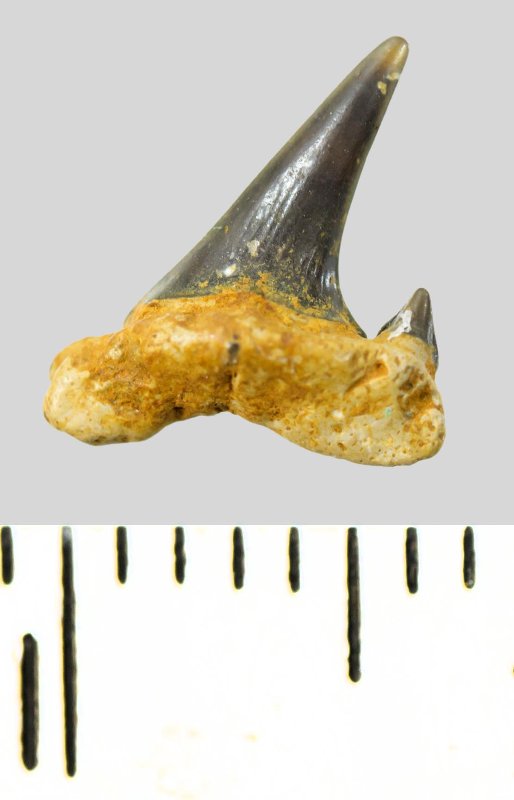 Мелкий боковой зуб с коронкой серого цвета, колюще-режущего типа, S-образно изогнутой, с гладким режущим краем. С лингвальной стороны у основания коронки на эмали имеется скульптура в виде слабой продольной струйчатости. Корень охристый, арочный, умеренно массивный, со следами окатанности. Имеется одна питательная борозда с лингвальной стороны корня. Имелась одна пара добавочных зубцов коронки, сохранился только правый.
