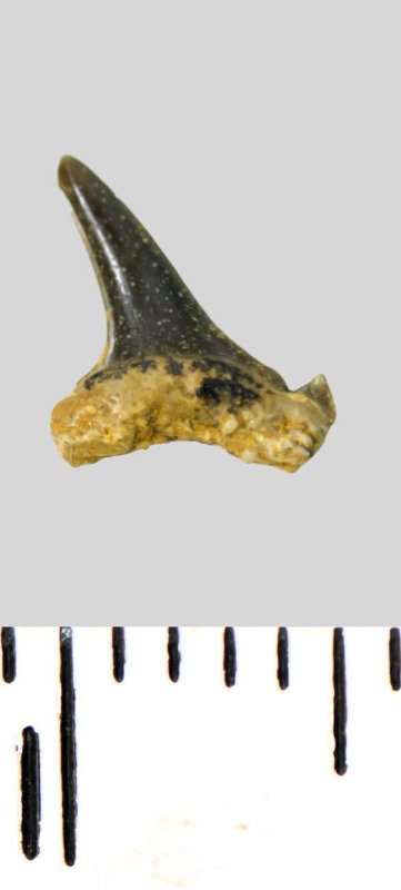 Мелкий боковой зуб с коронкой серого цвета, колюще-режущего типа, S-образно изогнутой, с гладким режущим краем. С лингвальной стороны у основания коронки на эмали имеется скульптура в виде слабой продольной струйчатости. Корень охристый, арочный, умеренно массивный, со следами окатанности. Имеется одна питательная борозда с лингвальной стороны корня. Имелась одна пара добавочных зубцов коронки, сохранился только правый.
