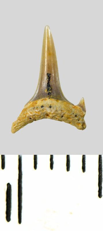 Мелкий боковой зуб с коронкой серого цвета, колюще-режущего типа, S-образно изогнутой, с гладким режущим краем. С лингвальной стороны у основания коронки на эмали имеется скульптура в виде слабой продольной струйчатости. Корень охристый, арочный, умеренно массивный, со следами окатанности. Имеется одна питательная борозда с лингвальной стороны корня. Имелась одна пара добавочных зубцов коронки, сохранился только правый.