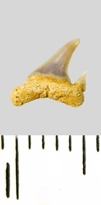 Мелкий боковой зуб с коронкой серого цвета, колюще-режущего типа, S-образно изогнутой, с гладким режущим краем. С лингвальной стороны у основания коронки на эмали имеется скульптура в виде слабой продольной струйчатости. Корень охристый, арочный, умеренно массивный, со следами окатанности. Имеется одна питательная борозда с лингвальной стороны корня. Имелась одна пара добавочных зубцов коронки, сохранился только правый.