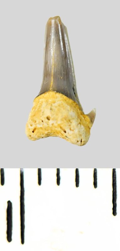 Мелкий боковой зуб с коронкой серого цвета, колюще-режущего типа, S-образно изогнутой, с гладким режущим краем. С лингвальной стороны у основания коронки на эмали имеется скульптура в виде слабой продольной струйчатости. Корень охристый, арочный, умеренно массивный, со следами окатанности. Имеется одна питательная борозда с лингвальной стороны корня. Имелась одна пара добавочных зубцов коронки, сохранился только правый.