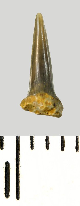 Зуб (фрагмент). Акула. Eostriatolamia subulata (Agassiz, 1843). Классификация: Хордовые Chordata, Позвоночные Vertebrata, Хрящевые рыбы Chondrichthyes, Пластиножаберные Elasmobranchii, Акулы Selachii, Ламнообразные Lamniformes, Песчаные акулы Odontaspididae