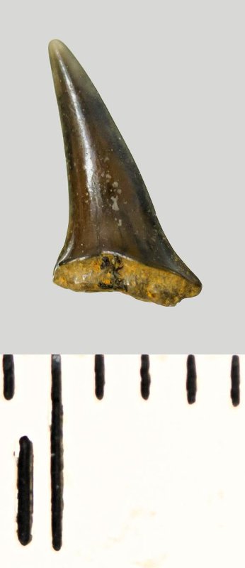 Зуб (фрагмент). Акула. Eostriatolamia subulata (Agassiz, 1843). Классификация: Хордовые Chordata, Позвоночные Vertebrata, Хрящевые рыбы Chondrichthyes, Пластиножаберные Elasmobranchii, Акулы Selachii, Ламнообразные Lamniformes, Песчаные акулы Odontaspididae