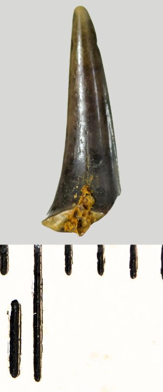 Коронка мелкого бокового зуба серого цвета, колюще-режущего типа, S-образно изогнутая, с гладким режущим краем. С лингвальной стороны у основания коронки на эмали имеется скульптура в виде слабой продольной струйчатости. Корень не сохранился