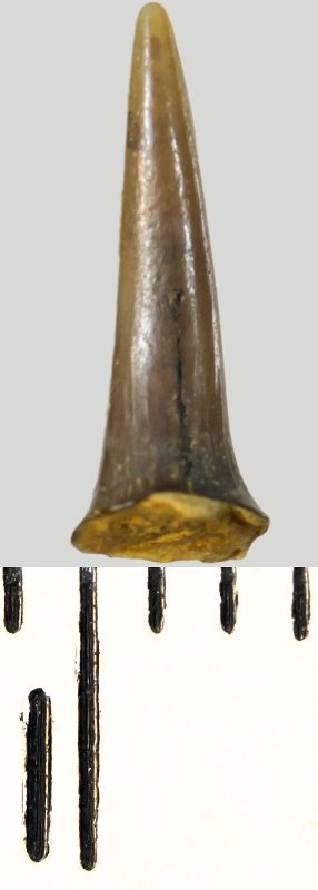Зуб (фрагмент). Акула. Eostriatolamia subulata (Agassiz, 1843). Классификация: Хордовые Chordata, Позвоночные Vertebrata, Хрящевые рыбы Chondrichthyes, Пластиножаберные Elasmobranchii, Акулы Selachii, Ламнообразные Lamniformes, Песчаные акулы Odontaspididae