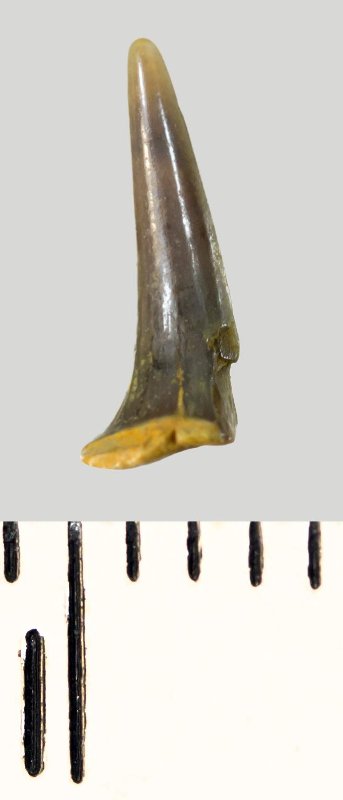 Коронка мелкого бокового зуба серого цвета, колюще-режущего типа, S-образно изогнутая, с гладким режущим краем. С лингвальной стороны у основания коронки на эмали имеется скульптура в виде слабой продольной струйчатости. Корень не сохранился