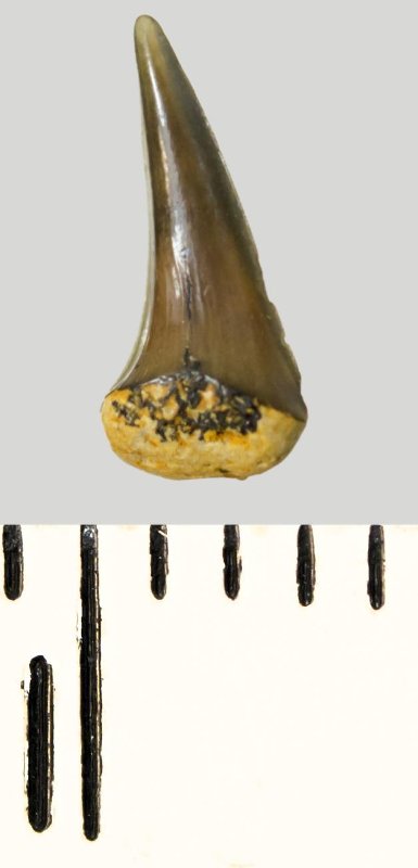 Зуб (фрагмент). Акула. Eostriatolamia subulata (Agassiz, 1843). Классификация: Хордовые Chordata, Позвоночные Vertebrata, Хрящевые рыбы Chondrichthyes, Пластиножаберные Elasmobranchii, Акулы Selachii, Ламнообразные Lamniformes, Песчаные акулы Odontaspididae