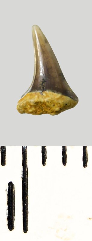 Зуб (фрагмент). Акула. Eostriatolamia subulata (Agassiz, 1843). Классификация: Хордовые Chordata, Позвоночные Vertebrata, Хрящевые рыбы Chondrichthyes, Пластиножаберные Elasmobranchii, Акулы Selachii, Ламнообразные Lamniformes, Песчаные акулы Odontaspididae