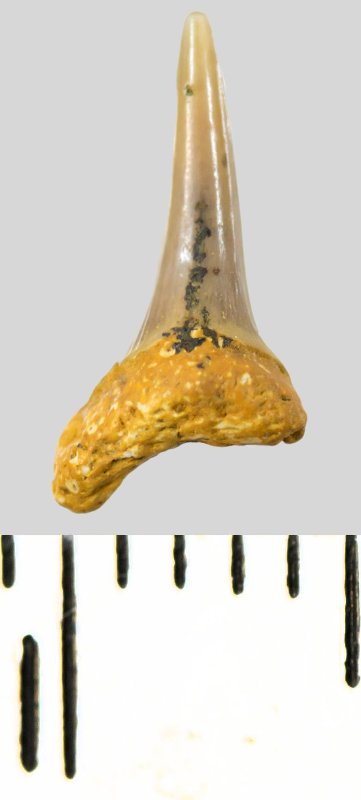Зуб. Акула. Eostriatolamia subulata (Agassiz, 1843). Классификация: Хордовые Chordata, Позвоночные Vertebrata, Хрящевые рыбы Chondrichthyes, Пластиножаберные Elasmobranchii, Акулы Selachii, Ламнообразные Lamniformes, Песчаные акулы Odontaspididae