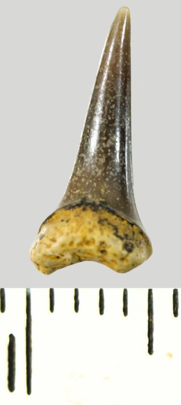 Мелкий боковой зуб с коронкой серого цвета, колюще-режущего типа, S-образно изогнутой, с гладким режущим краем. С лингвальной стороны у основания коронки на эмали имеется скульптура в виде слабой продольной струйчатости. Корень охристый, арочный, умеренно массивный, со следами окатанности. Имеется одна питательная борозда с лингвальной стороны корня. Добавочные зубцы коронки зуба отсутствуют.