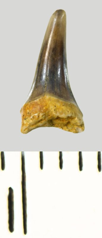 Мелкий боковой зуб с коронкой серого цвета, колюще-режущего типа, S-образно изогнутой, с гладким режущим краем. С лингвальной стороны у основания коронки на эмали имеется скульптура в виде слабой продольной струйчатости. Корень охристый, арочный, умеренно массивный, со следами окатанности. Имеется одна питательная борозда с лингвальной стороны корня. Добавочные зубцы коронки зуба отсутствуют.