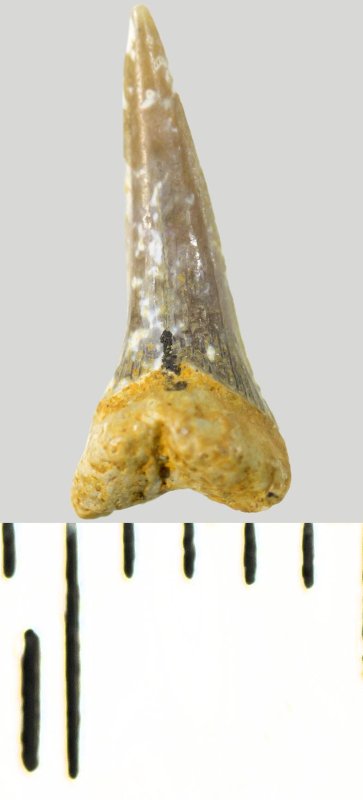 Зуб. Акула. Eostriatolamia subulata (Agassiz, 1843). Классификация: Хордовые Chordata, Позвоночные Vertebrata, Хрящевые рыбы Chondrichthyes, Пластиножаберные Elasmobranchii, Акулы Selachii, Ламнообразные Lamniformes, Песчаные акулы Odontaspididae