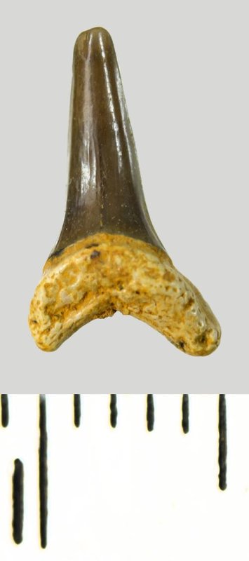 Мелкий боковой зуб с коронкой серого цвета, колюще-режущего типа, S-образно изогнутой, с гладким режущим краем. С лингвальной стороны у основания коронки на эмали имеется скульптура в виде слабой продольной струйчатости. Корень охристый, арочный, умеренно массивный, со следами окатанности. Имеется одна питательная борозда с лингвальной стороны корня. Добавочные зубцы коронки зуба отсутствуют.