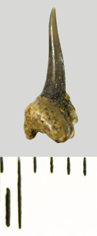 Мелкий боковой зуб с коронкой серого цвета, колюще-режущего типа, S-образно изогнутой, с гладким режущим краем. С лингвальной стороны у основания коронки на эмали имеется скульптура в виде слабой продольной струйчатости. Корень охристый, арочный, умеренно массивный, со следами окатанности. Имеется одна питательная борозда с лингвальной стороны корня. Добавочные зубцы коронки зуба отсутствуют.