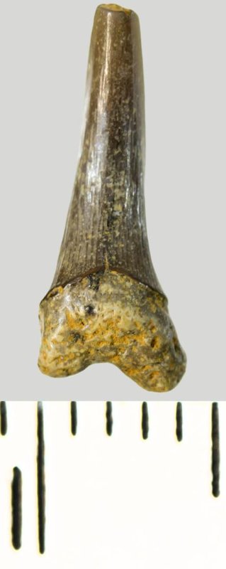 Мелкий боковой зуб с коронкой серого цвета, колюще-режущего типа, S-образно изогнутой, с гладким режущим краем. С лингвальной стороны у основания коронки на эмали имеется скульптура в виде слабой продольной струйчатости. Корень охристый, арочный, умеренно массивный, со следами окатанности. Имеется одна питательная борозда с лингвальной стороны корня. Добавочные зубцы коронки зуба отсутствуют.