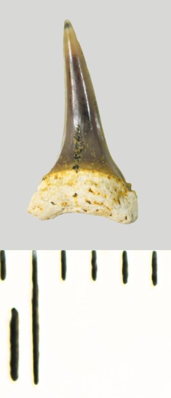 Мелкий боковой зуб с коронкой серого цвета, колюще-режущего типа, S-образно изогнутой, с гладким режущим краем. С лингвальной стороны у основания коронки на эмали имеется скульптура в виде слабой продольной струйчатости. Корень охристый, арочный, умеренно массивный, со следами окатанности. Имеется одна питательная борозда с лингвальной стороны корня. Добавочные зубцы коронки зуба отсутствуют.