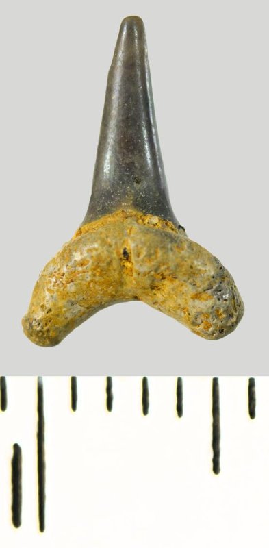 Мелкий боковой зуб с коронкой серого цвета, колюще-режущего типа, S-образно изогнутой, с гладким режущим краем. С лингвальной стороны у основания коронки на эмали имеется скульптура в виде слабой продольной струйчатости. Корень охристый, арочный, умеренно массивный, со следами окатанности. Имеется одна питательная борозда с лингвальной стороны корня. Добавочные зубцы коронки зуба отсутствуют.