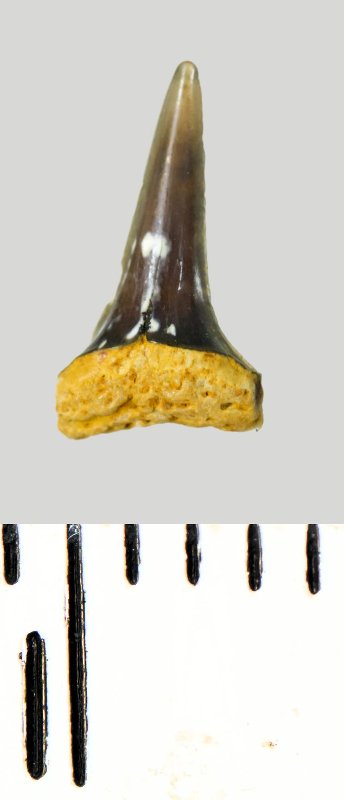 Зуб. Акула. Eostriatolamia subulata (Agassiz, 1843). Классификация: Хордовые Chordata, Позвоночные Vertebrata, Хрящевые рыбы Chondrichthyes, Пластиножаберные Elasmobranchii, Акулы Selachii, Ламнообразные Lamniformes, Песчаные акулы Odontaspididae