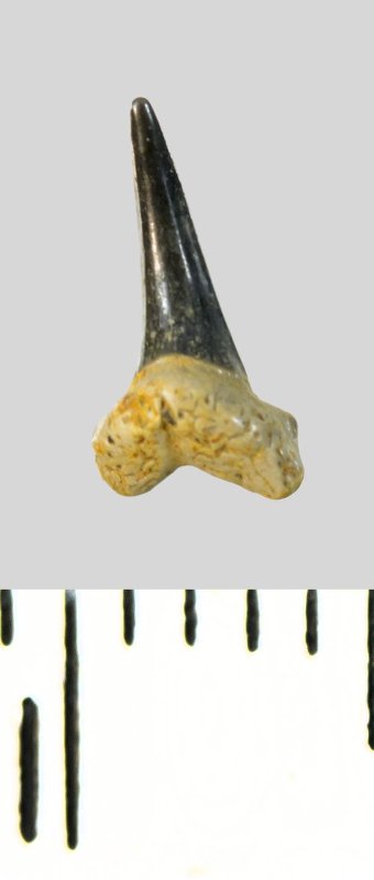 Мелкий боковой зуб с коронкой серого цвета, колюще-режущего типа, S-образно изогнутой, с гладким режущим краем. С лингвальной стороны у основания коронки на эмали имеется скульптура в виде слабой продольной струйчатости. Корень охристый, арочный, умеренно массивный, со следами окатанности. Имеется одна питательная борозда с лингвальной стороны корня. Добавочные зубцы коронки зуба отсутствуют.