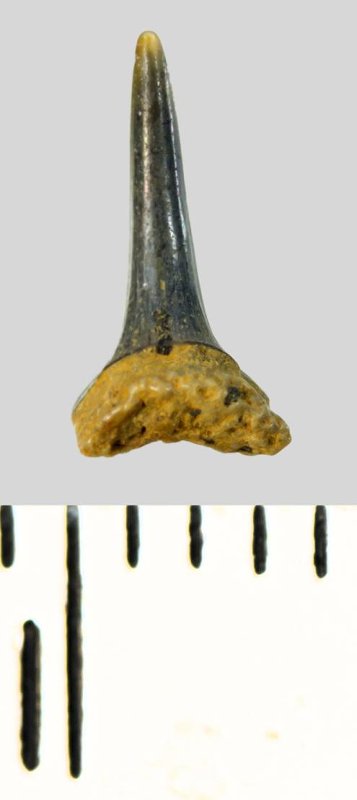 Мелкий боковой зуб с коронкой серого цвета, колюще-режущего типа, S-образно изогнутой, с гладким режущим краем. С лингвальной стороны у основания коронки на эмали имеется скульптура в виде слабой продольной струйчатости. Корень охристый, арочный, умеренно массивный, со следами окатанности. Имеется одна питательная борозда с лингвальной стороны корня. Добавочные зубцы коронки зуба отсутствуют.