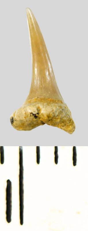 Мелкий боковой зуб с коронкой серого цвета, колюще-режущего типа, S-образно изогнутой, с гладким режущим краем. С лингвальной стороны у основания коронки на эмали имеется скульптура в виде слабой продольной струйчатости. Корень охристый, арочный, умеренно массивный, со следами окатанности. Имеется одна питательная борозда с лингвальной стороны корня. Добавочные зубцы коронки зуба отсутствуют.