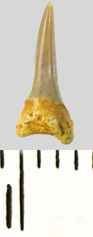 Мелкий боковой зуб с коронкой серого цвета, колюще-режущего типа, S-образно изогнутой, с гладким режущим краем. С лингвальной стороны у основания коронки на эмали имеется скульптура в виде слабой продольной струйчатости. Корень охристый, арочный, умеренно массивный, со следами окатанности. Имеется одна питательная борозда с лингвальной стороны корня. Добавочные зубцы коронки зуба отсутствуют.