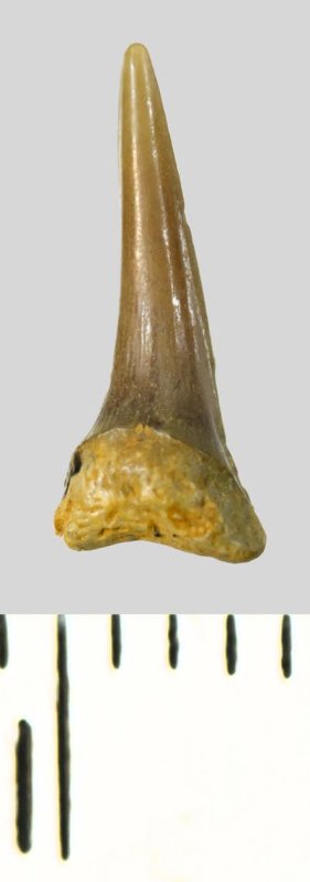 Мелкий боковой зуб с коронкой серого цвета, колюще-режущего типа, S-образно изогнутой, с гладким режущим краем. С лингвальной стороны у основания коронки на эмали имеется скульптура в виде слабой продольной струйчатости. Корень охристый, арочный, умеренно массивный, со следами окатанности. Имеется одна питательная борозда с лингвальной стороны корня. Добавочные зубцы коронки зуба отсутствуют.