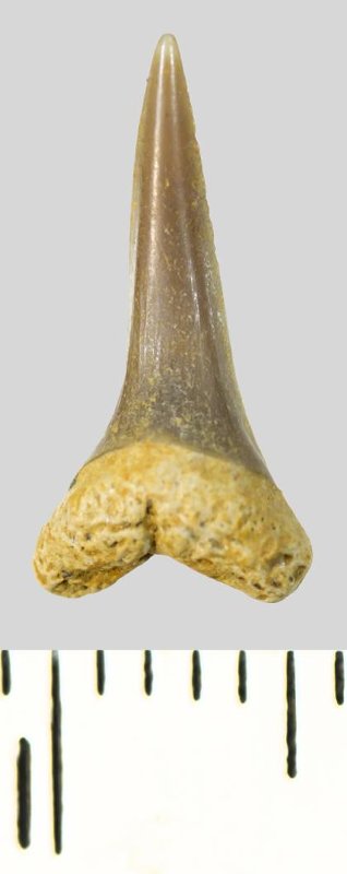 Мелкий боковой зуб с коронкой серого цвета, колюще-режущего типа, S-образно изогнутой, с гладким режущим краем. С лингвальной стороны у основания коронки на эмали имеется скульптура в виде слабой продольной струйчатости. Корень охристый, арочный, умеренно массивный, со следами окатанности. Имеется одна питательная борозда с лингвальной стороны корня. Добавочные зубцы коронки зуба отсутствуют.