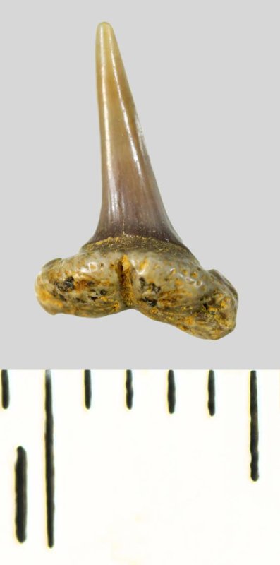 Мелкий боковой зуб с коронкой серого цвета, колюще-режущего типа, S-образно изогнутой, с гладким режущим краем. С лингвальной стороны у основания коронки на эмали имеется скульптура в виде слабой продольной струйчатости. Корень охристый, арочный, умеренно массивный, со следами окатанности. Имеется одна питательная борозда с лингвальной стороны корня. Добавочные зубцы коронки зуба отсутствуют.