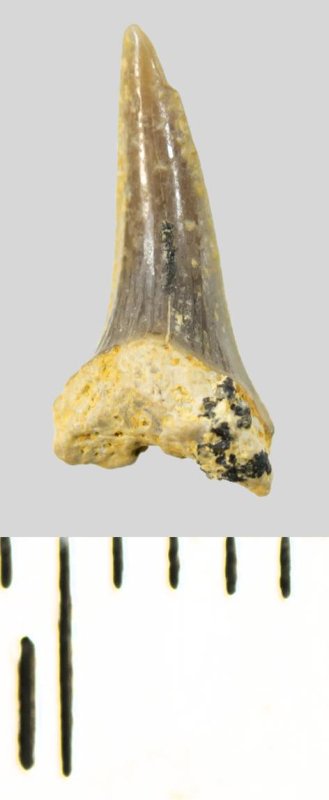 Мелкий боковой зуб с коронкой серого цвета, колюще-режущего типа, S-образно изогнутой, с гладким режущим краем. С лингвальной стороны у основания коронки на эмали имеется скульптура в виде слабой продольной струйчатости. Корень охристый, арочный, умеренно массивный, со следами окатанности. Имеется одна питательная борозда с лингвальной стороны корня. Добавочные зубцы коронки зуба отсутствуют.