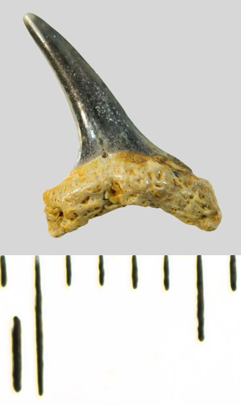Мелкий боковой зуб с коронкой серого цвета, колюще-режущего типа, S-образно изогнутой, с гладким режущим краем. С лингвальной стороны у основания коронки на эмали имеется скульптура в виде слабой продольной струйчатости. Корень охристый, арочный, умеренно массивный, со следами окатанности. Имеется одна питательная борозда с лингвальной стороны корня. Добавочные зубцы коронки зуба отсутствуют.