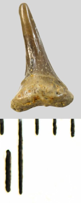 Мелкий боковой зуб с коронкой серого цвета, колюще-режущего типа, S-образно изогнутой, с гладким режущим краем. С лингвальной стороны у основания коронки на эмали имеется скульптура в виде слабой продольной струйчатости. Корень охристый, арочный, умеренно массивный, со следами окатанности. Имеется одна питательная борозда с лингвальной стороны корня. Добавочные зубцы коронки зуба отсутствуют.