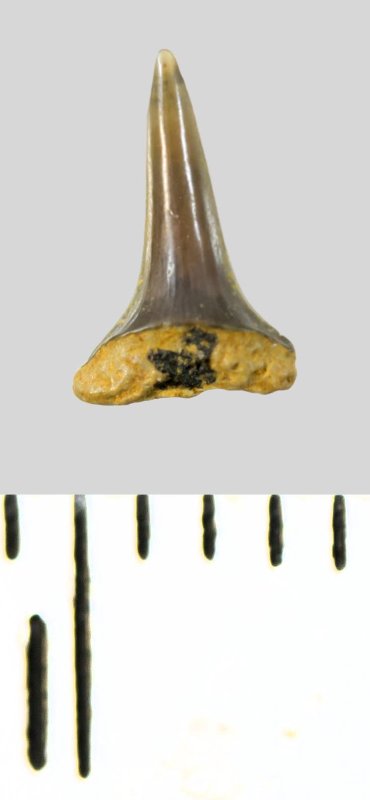Мелкий боковой зуб с коронкой серого цвета, колюще-режущего типа, S-образно изогнутой, с гладким режущим краем. С лингвальной стороны у основания коронки на эмали имеется скульптура в виде слабой продольной струйчатости. Корень охристый, арочный, умеренно массивный, со следами окатанности. Имеется одна питательная борозда с лингвальной стороны корня. Добавочные зубцы коронки зуба отсутствуют.