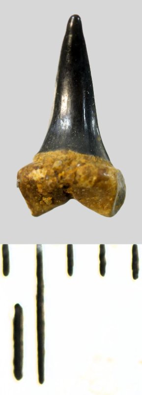 Мелкий боковой зуб с коронкой серого цвета, колюще-режущего типа, S-образно изогнутой, с гладким режущим краем. С лингвальной стороны у основания коронки на эмали имеется скульптура в виде слабой продольной струйчатости. Корень охристый, арочный, умеренно массивный, со следами окатанности. Имеется одна питательная борозда с лингвальной стороны корня. Добавочные зубцы коронки зуба отсутствуют.