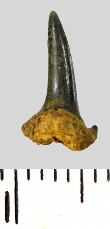 Мелкий боковой зуб с коронкой серого цвета, колюще-режущего типа, S-образно изогнутой, с гладким режущим краем. С лингвальной стороны у основания коронки на эмали имеется скульптура в виде слабой продольной струйчатости. Корень охристый, арочный, умеренно массивный, со следами окатанности. Имеется одна питательная борозда с лингвальной стороны корня. Имелась одна пара добавочных зубцов коронки, сохранился только правый.