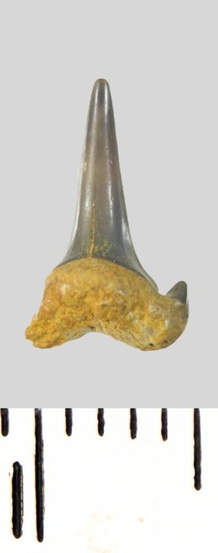 Мелкий боковой зуб с коронкой серого цвета, колюще-режущего типа, S-образно изогнутой, с гладким режущим краем. С лингвальной стороны у основания коронки на эмали имеется скульптура в виде слабой продольной струйчатости. Корень охристый, арочный, умеренно массивный, со следами окатанности. Имеется одна питательная борозда с лингвальной стороны корня. Имелась одна пара добавочных зубцов коронки, сохранился только правый.