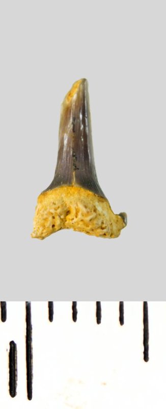 Мелкий боковой зуб с коронкой серого цвета, колюще-режущего типа, S-образно изогнутой, с гладким режущим краем. С лингвальной стороны у основания коронки на эмали имеется скульптура в виде слабой продольной струйчатости. Корень охристый, арочный, умеренно массивный, со следами окатанности. Имеется одна питательная борозда с лингвальной стороны корня. Имелась одна пара добавочных зубцов коронки, сохранился только правый.