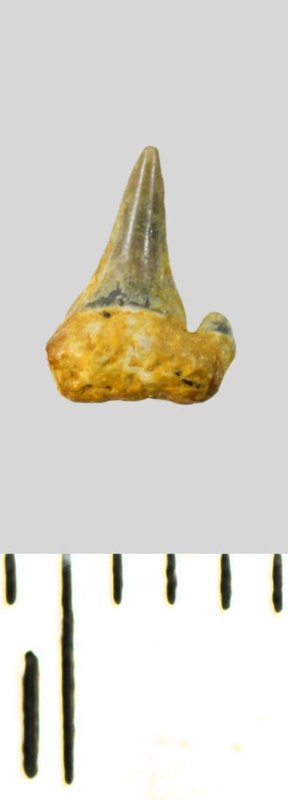Мелкий боковой зуб с коронкой серого цвета, колюще-режущего типа, S-образно изогнутой, с гладким режущим краем. С лингвальной стороны у основания коронки на эмали имеется скульптура в виде слабой продольной струйчатости. Корень охристый, арочный, умеренно массивный, со следами окатанности. Имеется одна питательная борозда с лингвальной стороны корня. Имелась одна пара добавочных зубцов коронки, сохранился только правый.