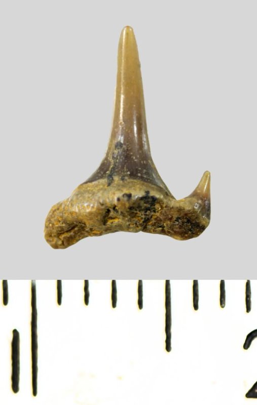 Мелкий боковой зуб с коронкой серого цвета, колюще-режущего типа, S-образно изогнутой, с гладким режущим краем. С лингвальной стороны у основания коронки на эмали имеется скульптура в виде слабой продольной струйчатости. Корень охристый, арочный, умеренно массивный, со следами окатанности. Имеется одна питательная борозда с лингвальной стороны корня. Имелась одна пара добавочных зубцов коронки, сохранился только правый.