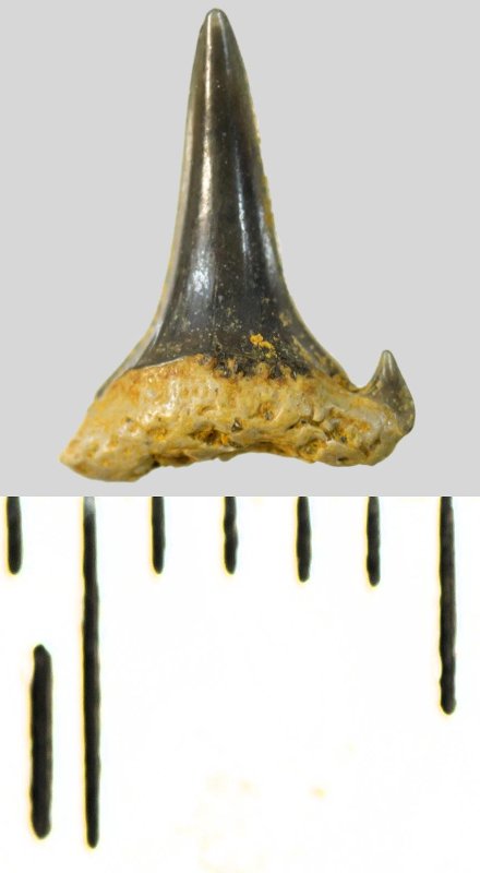 Мелкий боковой зуб с коронкой серого цвета, колюще-режущего типа, S-образно изогнутой, с гладким режущим краем. С лингвальной стороны у основания коронки на эмали имеется скульптура в виде слабой продольной струйчатости. Корень охристый, арочный, умеренно массивный, со следами окатанности. Имеется одна питательная борозда с лингвальной стороны корня. Имелась одна пара добавочных зубцов коронки, сохранился только правый.