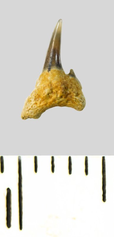 Мелкий боковой зуб с коронкой серого цвета, колюще-режущего типа, S-образно изогнутой, с гладким режущим краем. С лингвальной стороны у основания коронки на эмали имеется скульптура в виде слабой продольной струйчатости. Корень охристый, арочный, умеренно массивный, со следами окатанности. Имеется одна питательная борозда с лингвальной стороны корня. Имелась одна пара добавочных зубцов коронки, сохранился только правый.