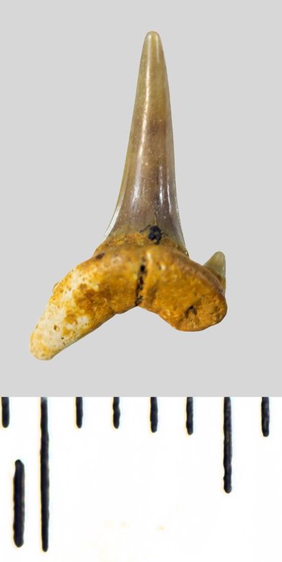 Мелкий боковой зуб с коронкой серого цвета, колюще-режущего типа, S-образно изогнутой, с гладким режущим краем. С лингвальной стороны у основания коронки на эмали имеется скульптура в виде слабой продольной струйчатости. Корень охристый, арочный, умеренно массивный, со следами окатанности. Имеется одна питательная борозда с лингвальной стороны корня. Имелась одна пара добавочных зубцов коронки, сохранился только правый.