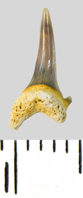 Мелкий боковой зуб с коронкой серого цвета, колюще-режущего типа, S-образно изогнутой, с гладким режущим краем. С лингвальной стороны у основания коронки на эмали имеется скульптура в виде слабой продольной струйчатости. Корень охристый, арочный, умеренно массивный, со следами окатанности. Имеется одна питательная борозда с лингвальной стороны корня. Имелась одна пара добавочных зубцов коронки, сохранился только правый.