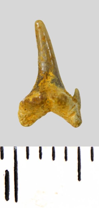 Мелкий боковой зуб с коронкой серого цвета, колюще-режущего типа, S-образно изогнутой, с гладким режущим краем. С лингвальной стороны у основания коронки на эмали имеется скульптура в виде слабой продольной струйчатости. Корень охристый, арочный, умеренно массивный, со следами окатанности. Имеется одна питательная борозда с лингвальной стороны корня. Имелась одна пара добавочных зубцов коронки, сохранился только правый.