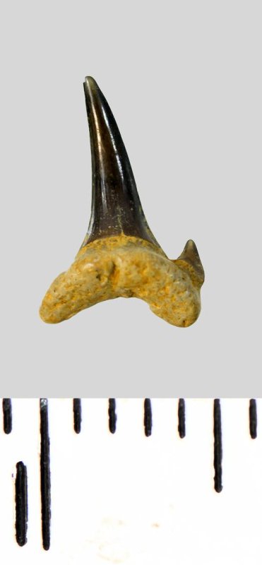 Мелкий боковой зуб с коронкой серого цвета, колюще-режущего типа, S-образно изогнутой, с гладким режущим краем. С лингвальной стороны у основания коронки на эмали имеется скульптура в виде слабой продольной струйчатости. Корень охристый, арочный, умеренно массивный, со следами окатанности. Имеется одна питательная борозда с лингвальной стороны корня. Имелась одна пара добавочных зубцов коронки, сохранился только правый.