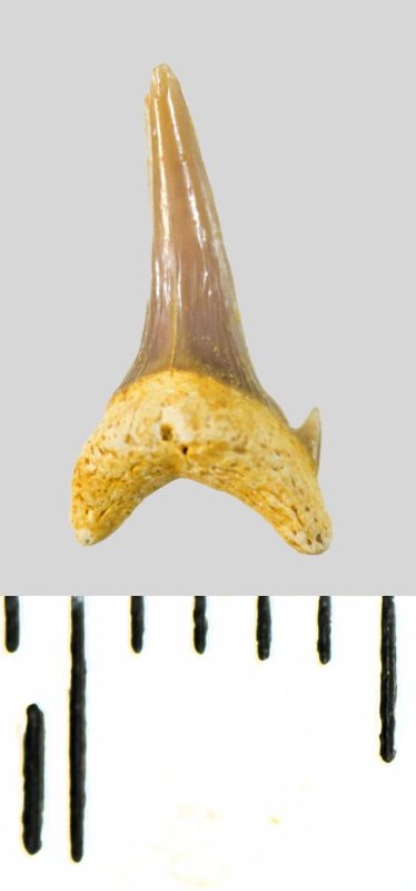 Мелкий боковой зуб с коронкой серого цвета, колюще-режущего типа, S-образно изогнутой, с гладким режущим краем. С лингвальной стороны у основания коронки на эмали имеется скульптура в виде слабой продольной струйчатости. Корень охристый, арочный, умеренно массивный, со следами окатанности. Имеется одна питательная борозда с лингвальной стороны корня. Имелась одна пара добавочных зубцов коронки, сохранился только правый.