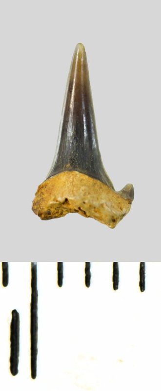 Мелкий боковой зуб с коронкой серого цвета, колюще-режущего типа, S-образно изогнутой, с гладким режущим краем. С лингвальной стороны у основания коронки на эмали имеется скульптура в виде слабой продольной струйчатости. Корень охристый, арочный, умеренно массивный, со следами окатанности. Имеется одна питательная борозда с лингвальной стороны корня. Имелась одна пара добавочных зубцов коронки, сохранился только правый.